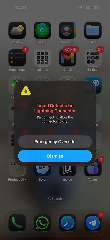 Saņemot preci, viss vizuāli izskatījās kārtībā — vads bija jaunā kastītē, iepakojums nevainojams. Taču, pieslēdzot šo vadu telefonam, uzreiz parādījās paziņojums par šķidruma iedarbību un telefons nelādējās.
