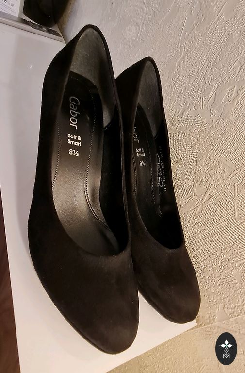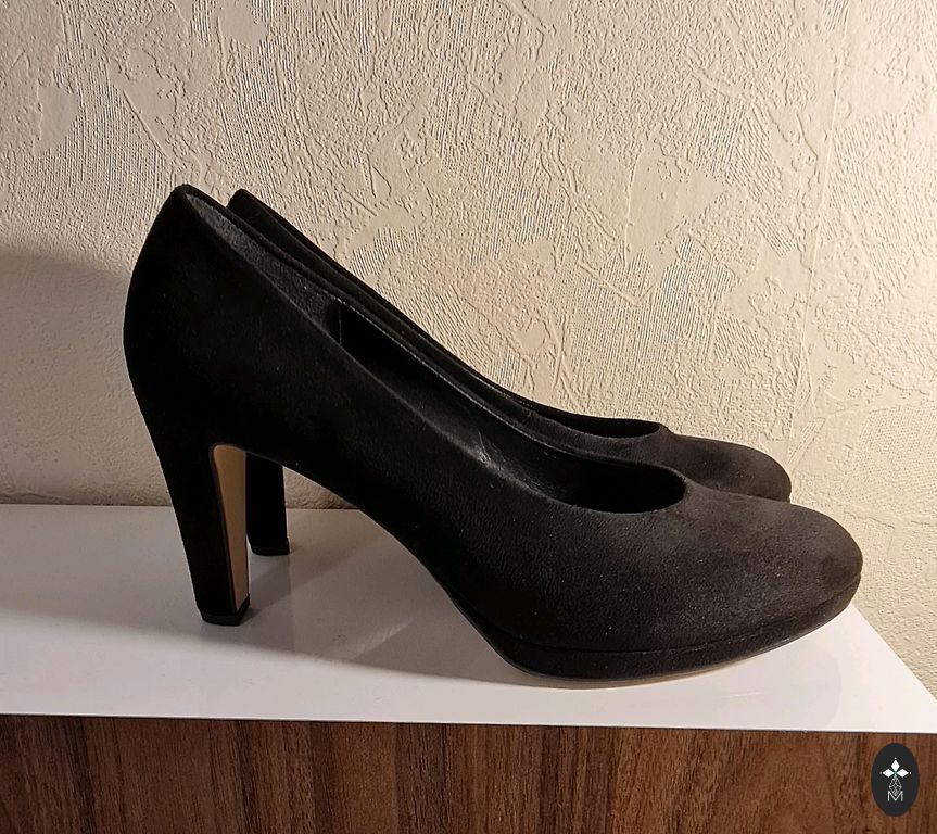 Klasikiniai juodi zomšiniai batai. Vokiška kokybė, zomša su subtiliu blizgesiu, odinis pamušalas ir vidpadis su papildomu paminkštinimu. Stabilus 56 mm kulnas. Naudota 1 kartą.