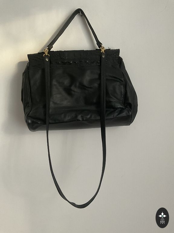 Didelis dirbtinės odos krepšys su užtrauktuku, viduje be kišenių. Matmenys 41/30/11 cm, rankenos 64 cm.