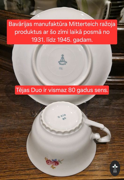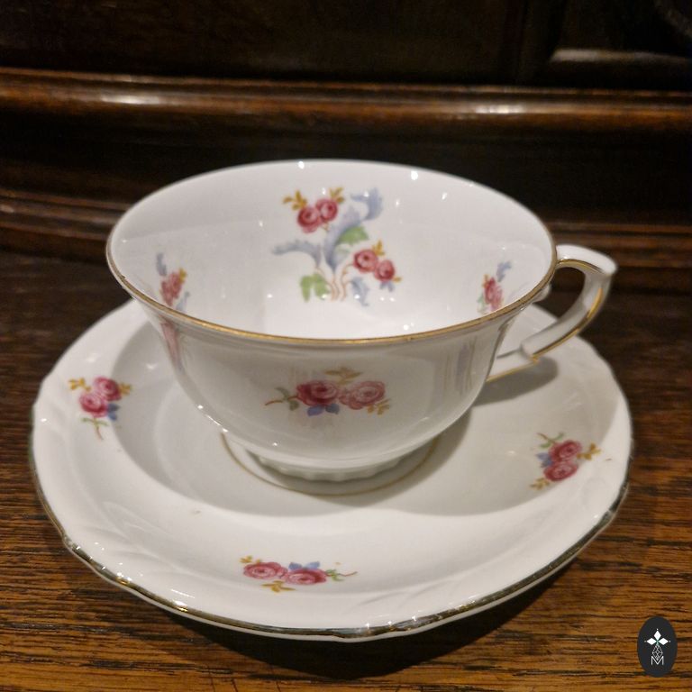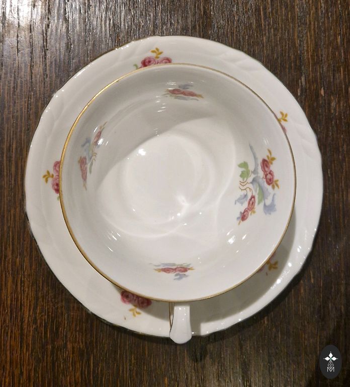 Porcelāna tējas, kafijas servīze. Servīzē ietilpst 5 mazas tasītes ar apakštasītēm, cukurtrauks, piena krūka un tējas/ kafijas kanniņa.