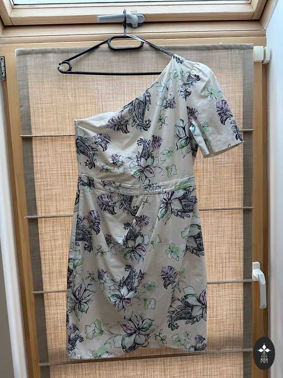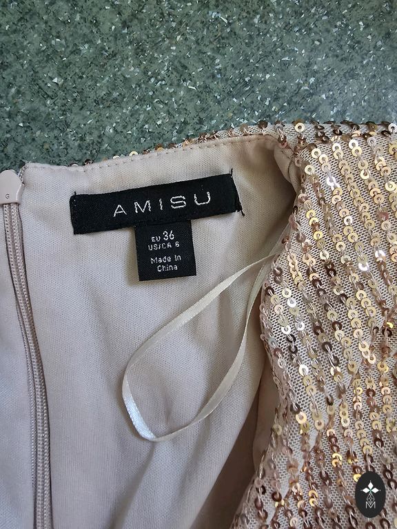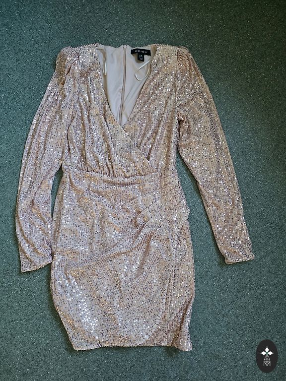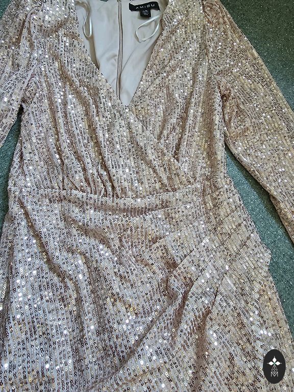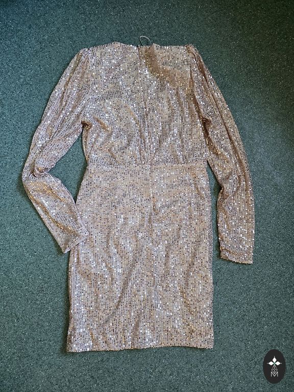 Parduodu suknelę su blizgučiais ir kutais. Krūtinės apimtis 45 cm, ilgis 150 cm. Liemuo išsitempia iki 45 cm apimties. Ant liekno kūno nesikraipo, priglunda prie figūros. Suknelė buvo dėvėta vieną kartą, dvi valandas. Nugaroje yra užtrauktukas. Pritaikyta. Su ja švytėsite kaip karalienė.