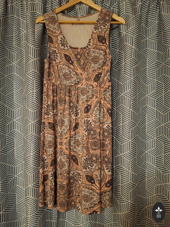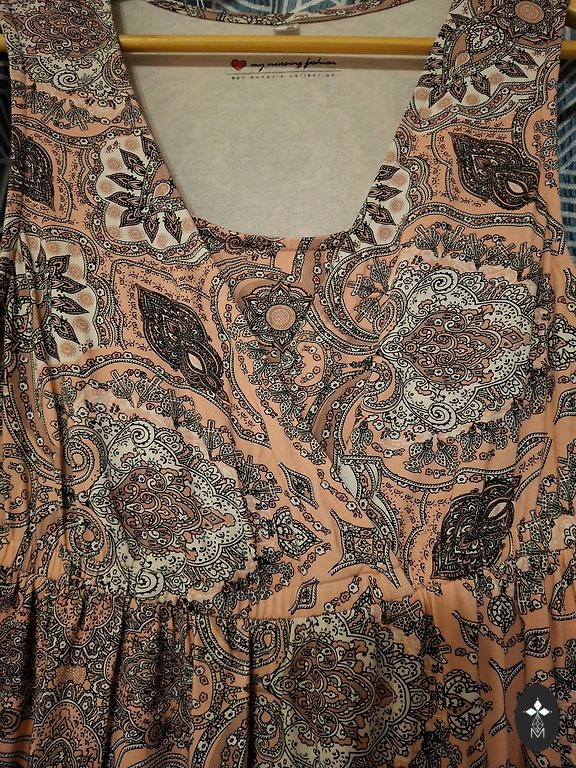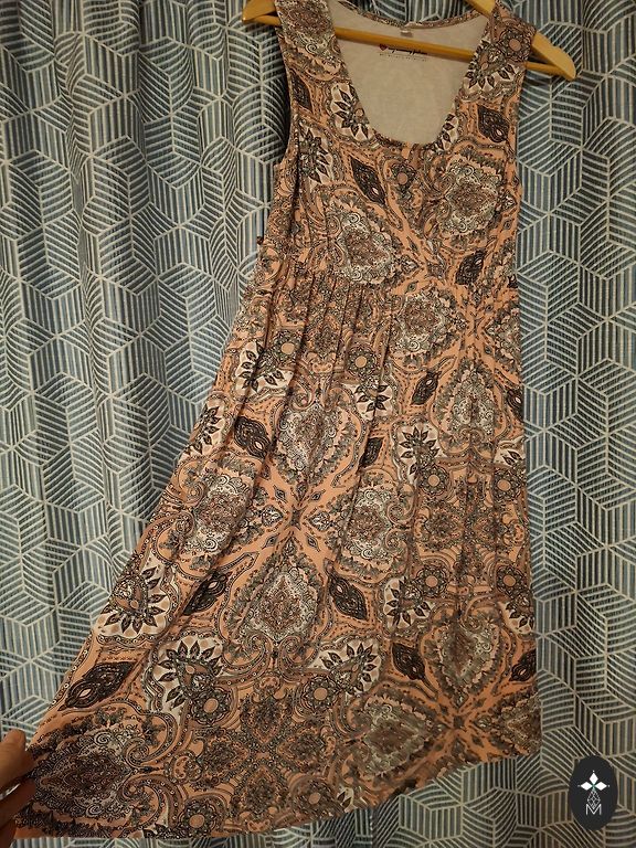 Viegla auduma,plāna kleitiņa, vidusdaļā speciàli veidots vaļējs trijstūrītis, apakšdaļa saules griezumā,aizmugures aizdare ar rāvējslēdzēju.