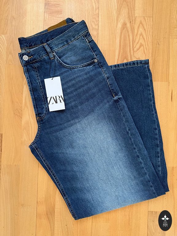 Nauji, bet deja „etiketė“ pašalinta tamsiai mėlyni džinsai.