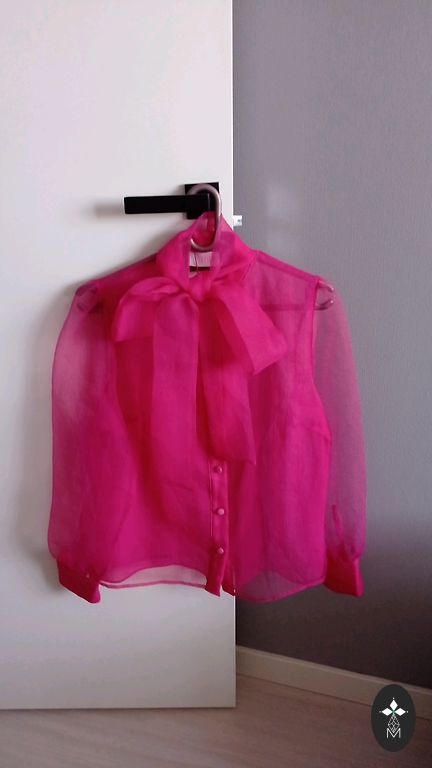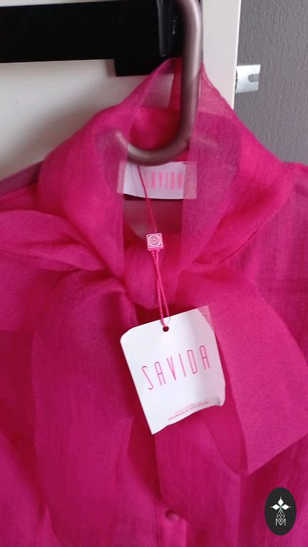 Naujas M dydžio iš 100% natūralaus šilko fuksijos spalvos laisvo kirpimo su 3/4 rankovių ilgiu elegantiškas palaidinukė su pamušalu/viskoze/. Vidinė apačia apdorota guma, kur palaidinukė sukuria gerą audinio kritimą. Palaidinukės ilgis 60, per krūtinės liniją nuo pažasties iki pažasties 48, rankovė 42 cm.
