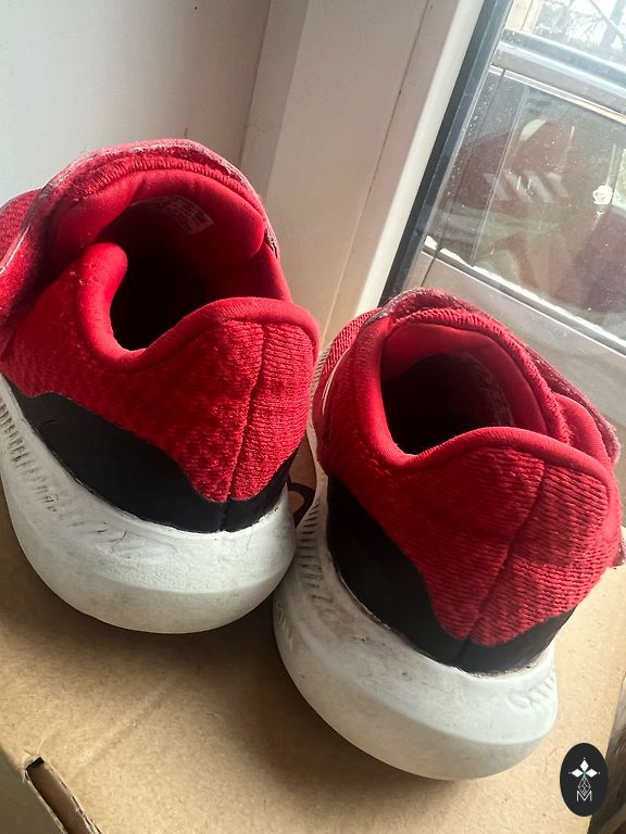 Patogūs batai, dėvėti mokykloje per sporto pamokas. Dydis 41, bet iš tikrųjų tinka 39-40 dydžiui. Nuotraukoje matyti, kad vieno bato viršutinis kraštas ir ženklas ant liežuvio yra nusidėvėję.