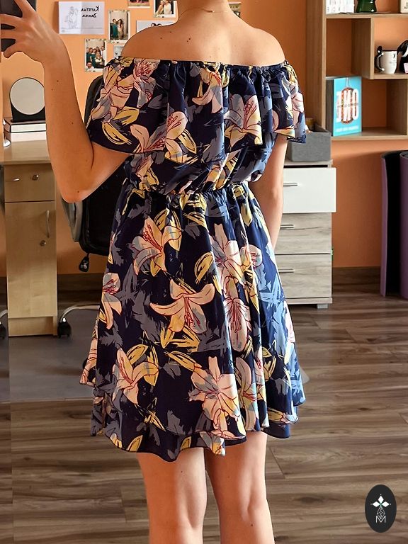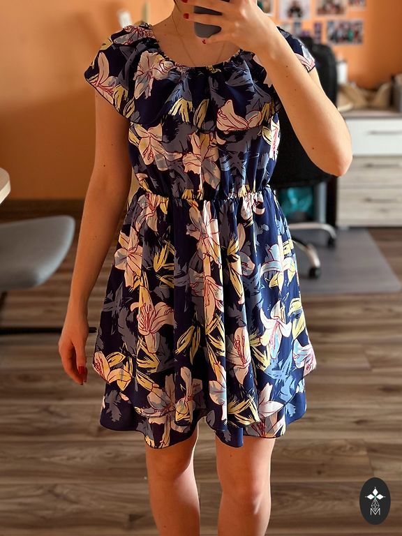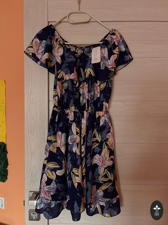 Beautiful, accentuated dress with buttons. Comes with a belt. Suitable for M/L. Length 87 cm. Waist 84 cm. Under the armpits 96 cm.
