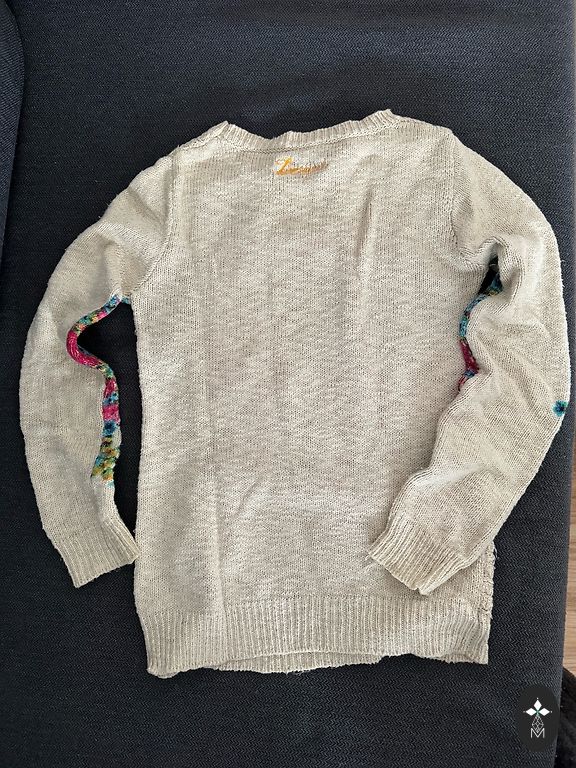 Trumpas, iki juosmens, rankovės ir apačia išplatėjusios, pailgintos. Nors parašyta L, tiks S, XS dydžio savininkėms. Galima dėvėti tiek su ilgais sijonais, tiek su plačiomis audinio kelnėmis, taip pat kasdien - su džinsais. Apačioje pageidautina maikutė.