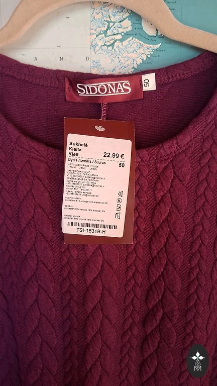 Nauja suknelė, šiek tiek laisva, ne itin plona, be raukšlių, nedidelis įplėšimas apačioje nugaroje, krūtinė 120–124 cm, klubai 132 cm, ilgis 125 cm. Dydis nurodytas kaip 3XL.