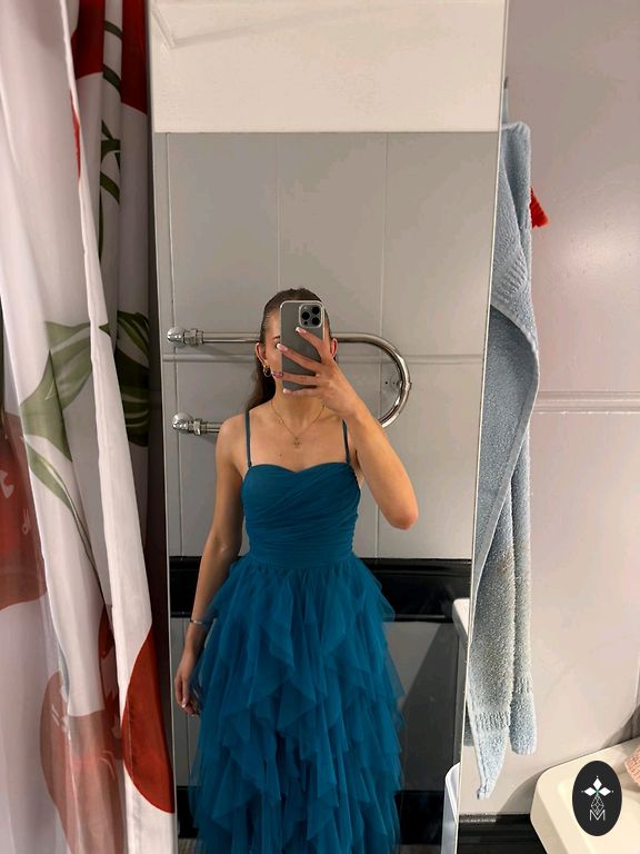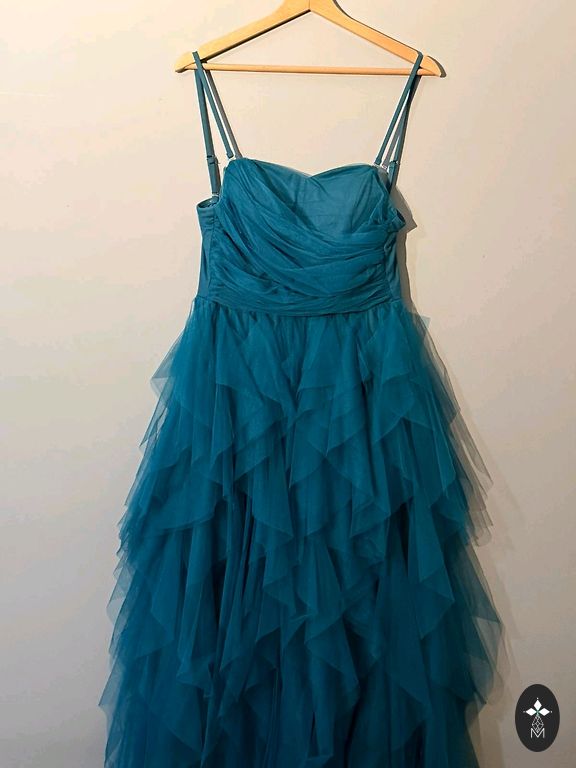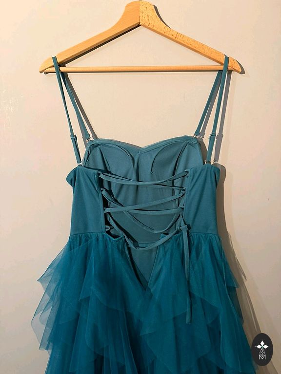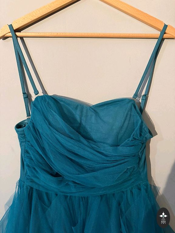 Suknelė iš keturių dalių: korsetas, sijonas su lanku, krentanti sijono dalis ir viršuje surauktas tiulis.
