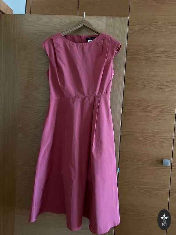 Elegantiška, klasikinio stiliaus suknelė, tinkanti tiek kasdieniam nešiojimui, tiek ypatingoms progoms, jei priderinti tinkami aksesuarai. Standus, nepermatomas megztas audinys, kuris gerai priglunda prie kūno ir pabrėžia moters grožį, tuo pačiu paslėpdamas tai, ką reikia paslėpti. Labai geras kirpimas, aukštos kokybės siuvimas. Viršuje – nėrinių detalės. Dydis M/40, nauja.