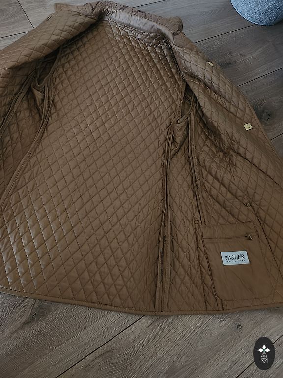 A beautiful women's sand-colored autumn jacket with a knitted brown collar and sleeve ends, unlined but made of warm material because it contains wool. The jacket has pockets on the sides.