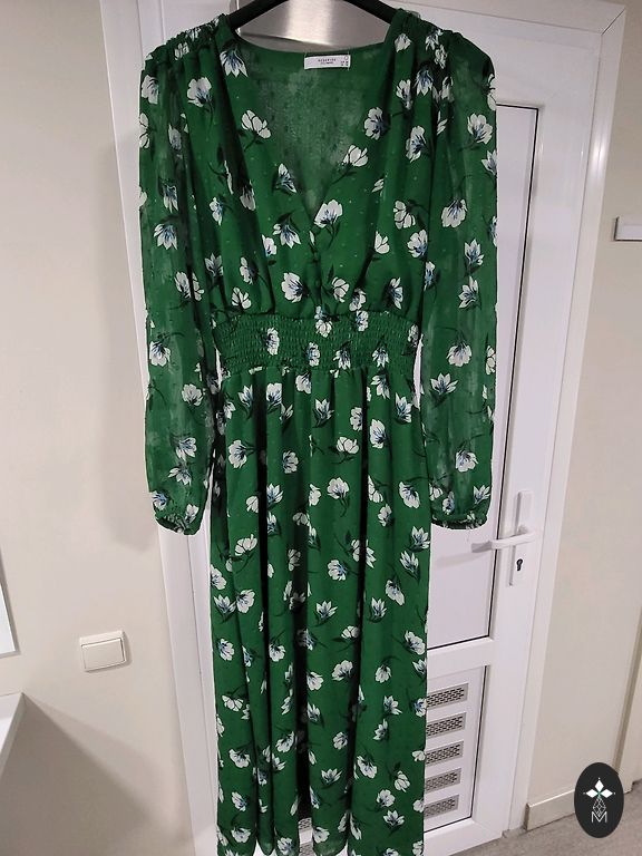 Õhukeste õlapaeltega kleit. Rinnaosas kangas on kahekordne, ei paista läbi, saab kanda ilma rinnahoidjata. Tagaküljel, alumises osas kangas veidi KROOGITUD. Näha pildil. Suurus XS-S.