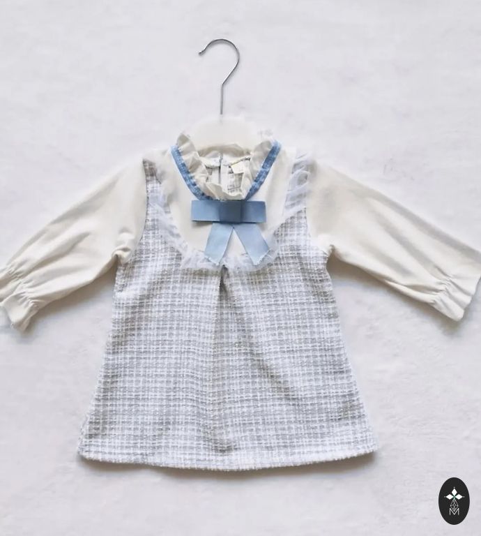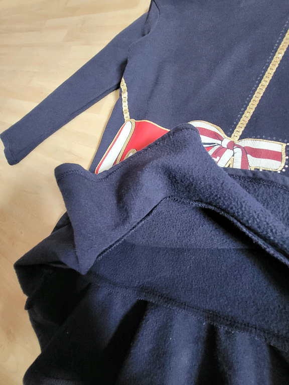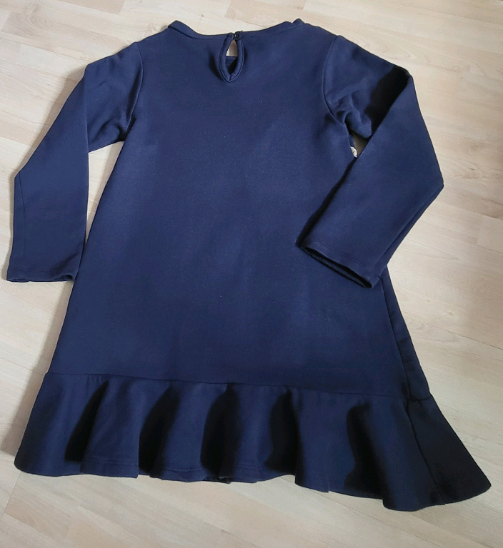 Helesinine värv mustade täppidega. Suurus on märgitud 62 cm, kuid see sobib ka pikemaks. Lai. Rüüsid õlgadel.