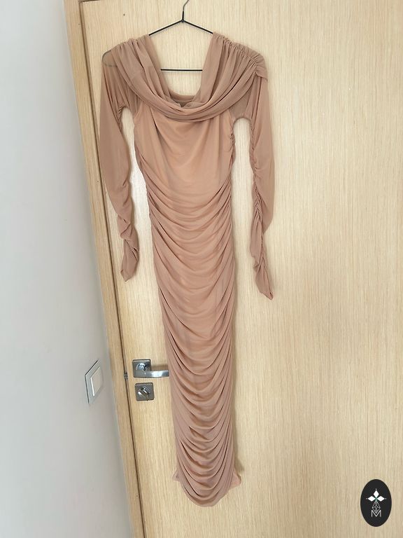 Eleganti vakarinė suknelė, tamsiai violetinė, su kišenėmis. Ilgis ~165 cm, juosmens viena pusė ~41 cm. Yra dirželis, užsegimas gale.