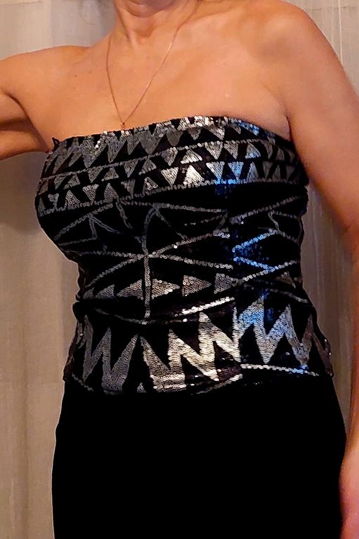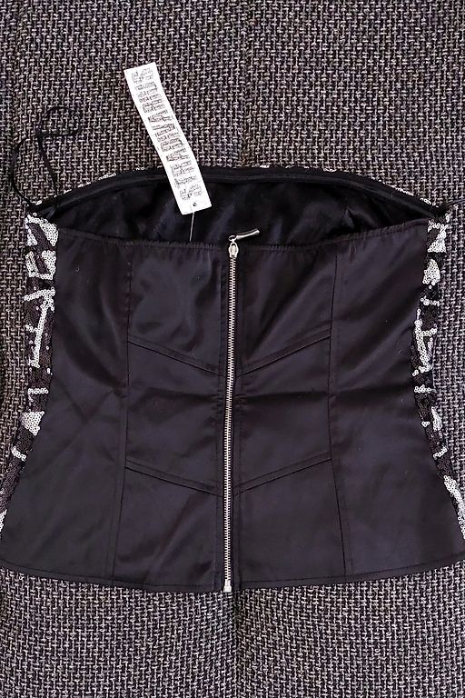Juoda + kreminė spalva. Nauja, pirkta JAV. Liemens 75 cm, sijono dalies ilgis 52 cm.