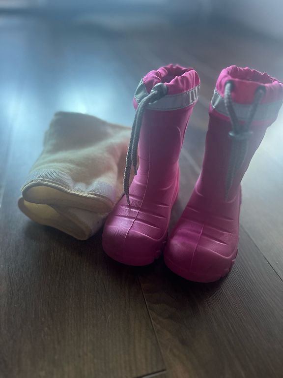 Winter boots for a girl, size 22, for measurement, with Velcro at the front and a zipper on the side. Worn by one child for one season. Small scratches are visible in the photo.