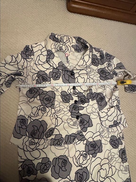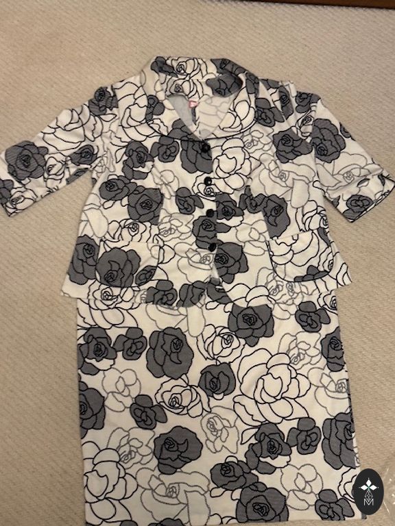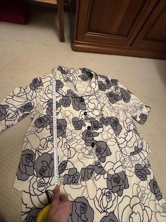Kostīms 50 izm. sastāv no kleitas un žaketes ar oderi, žaketes krūšu apkārtmērs 60x2, gurnos 60+x2, garums 60cm, kleitas krūšu apkārtmērs 55+x2, gurnos 60+x2, garums 140cm