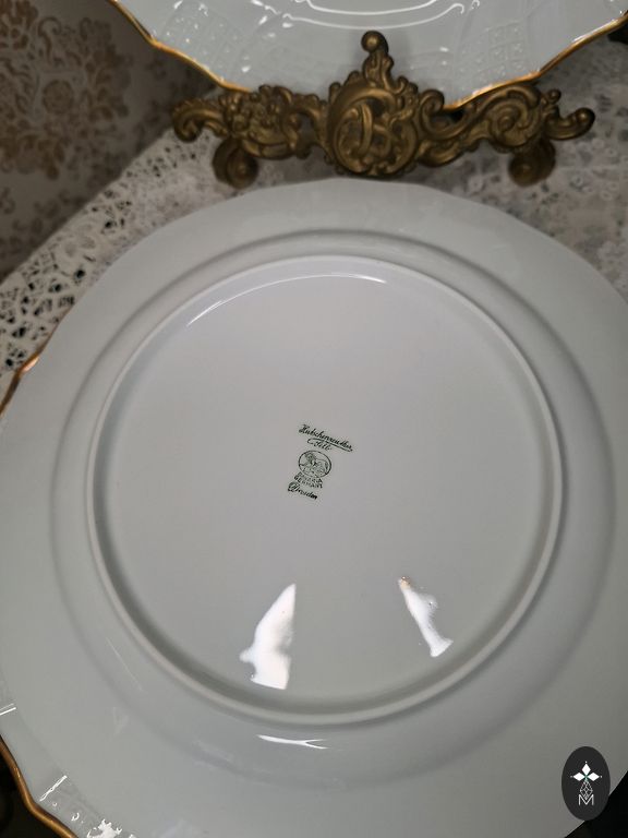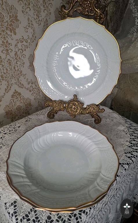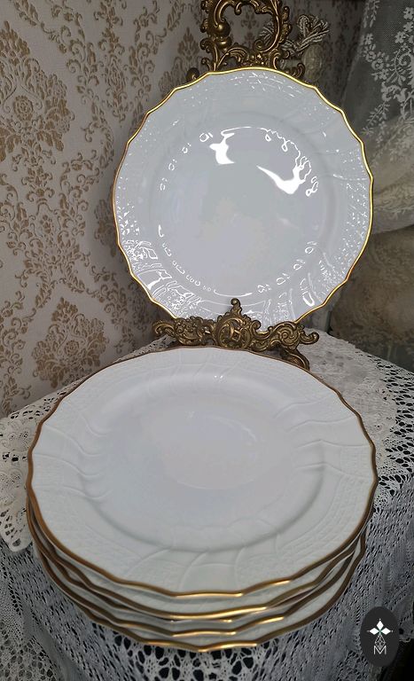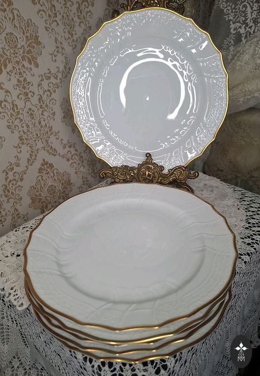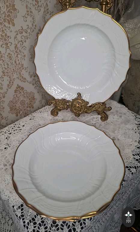 Lõunaserviis "Vārpa" suured supitaldrikud - 4 tk. Läbimõõt - 24,5 cm, tempel - "RPF Rīga", on kuldkao. Ühel taldrikul on kuldjoon laiem. Hind kõigi eest.