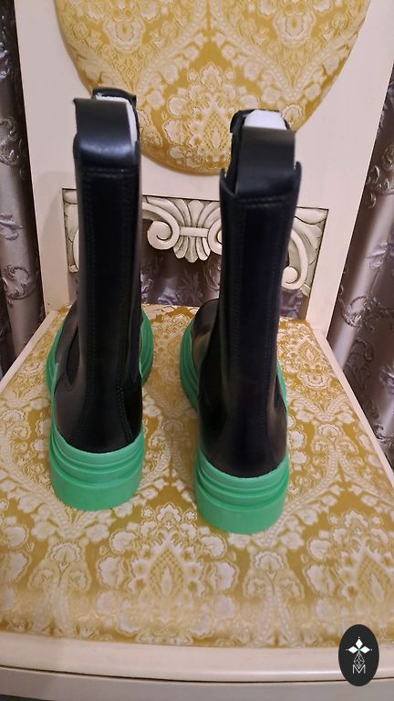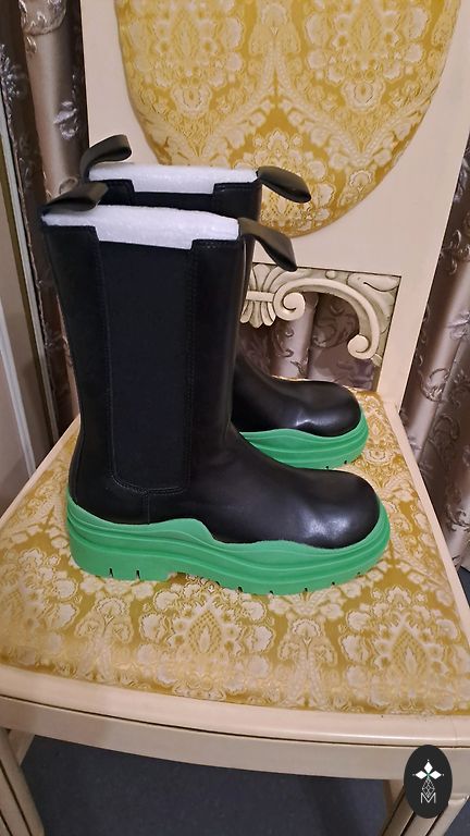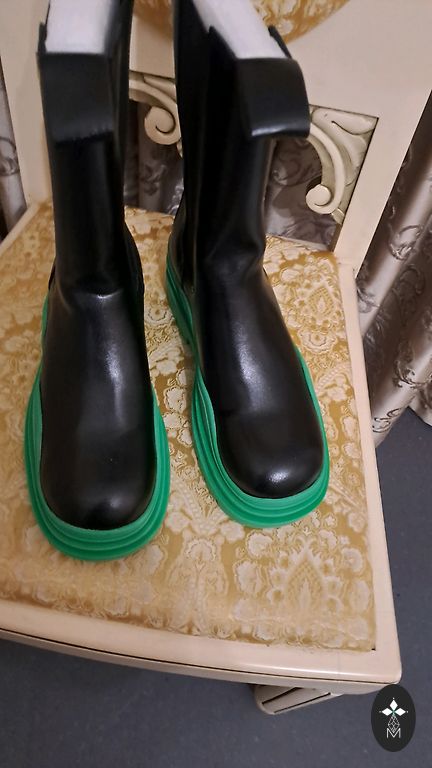 The boots are designed for autumn and spring, as the inner part of the foot is made of leather, while the outer part is made of nylon-type fabric and suede. The sole is 4 cm high, and the boot is 29 cm high including the sole. The inner foot is 24 cm long.