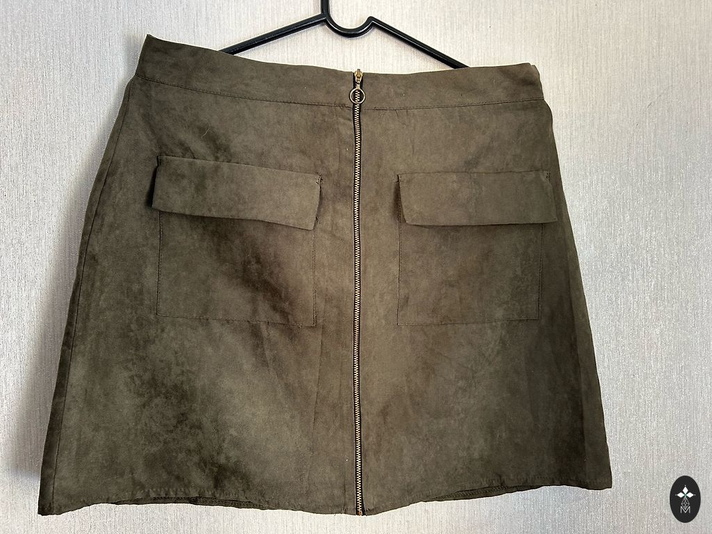 Aukštos kokybės megztas audinys su raukiniais. Sijonas turi elastingą juosmenį su elastine vidine dalimi (x2) 44 cm, klubų apimtis 53 cm. Ilgis 50 cm. Pristatymas 1,99.