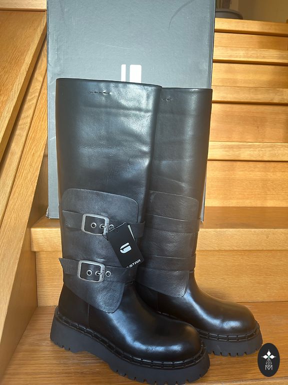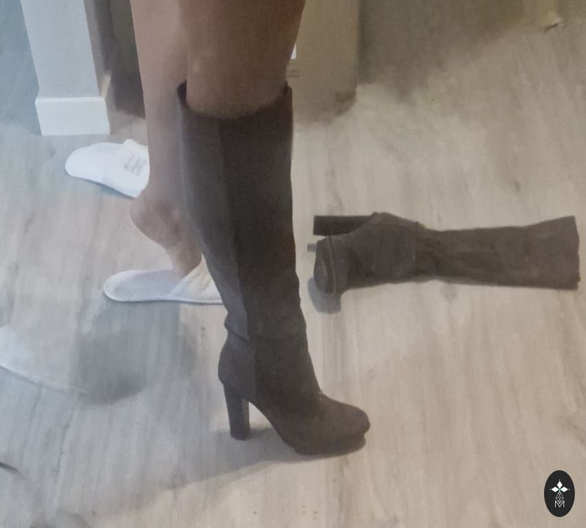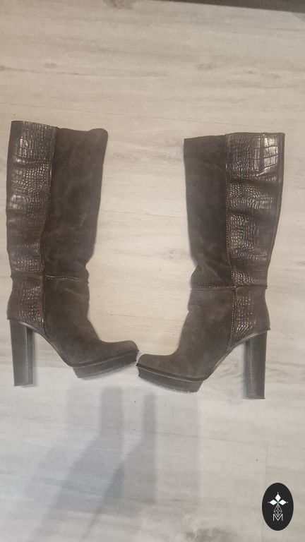 Priekyje nedidelė odos įbrėžimas! Kulnas aukštis 9 cm, aulo ilgis 46 cm. Su dėžute ir dulkių maišeliu.