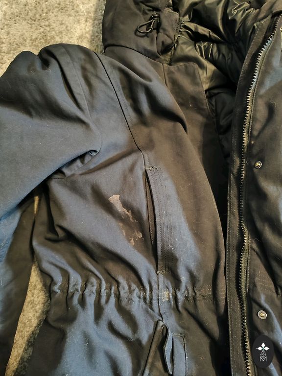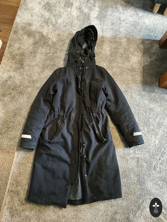 Žiemos parkas beveik be trūkumų. Pamesta nuimama pūka. Vizualiai labai geros būklės. Šiek tiek prie kišenių matomos naudojimo žymės, bet jas mato tik iš arti. Taip pat ant mygtukų matomi įbrėžimai, atsiradę naudojant.