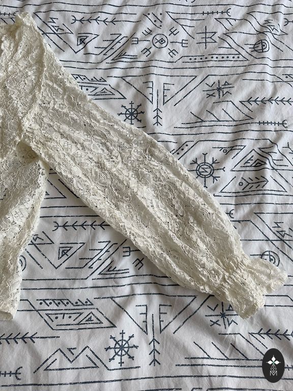 Chest-95cm, hips-95cm, sleeves-63cm, length-62cm. Tie-up lace collar, sewn on the back.