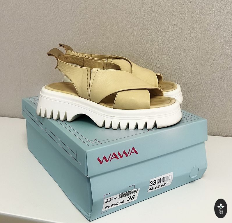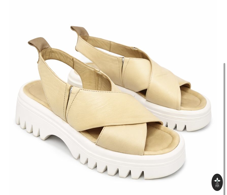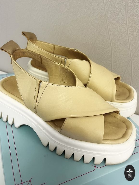 Несколько раз надетые кожаные сандалии на платформе. Самая низкая часть подошвы - 2 см, самая высокая (каблук) - 9 см.