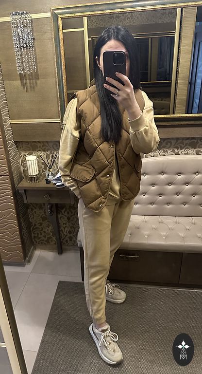 Dygsniuotas šiltos vestės vėsiam orui. Ilgis 100 cm. Šonuose nedideli skeltukai. Puikiai derės prie smėlio spalvos avalynės kaip paskutinėje nuotraukoje.