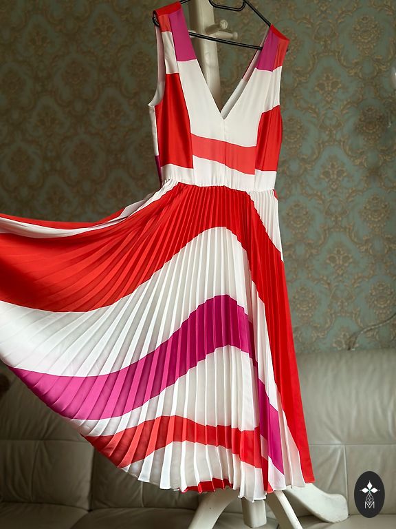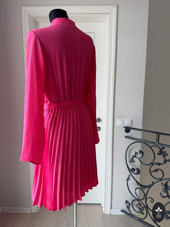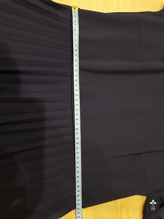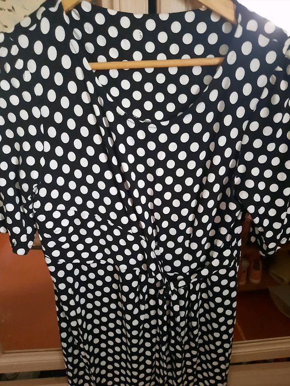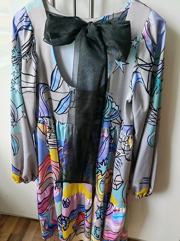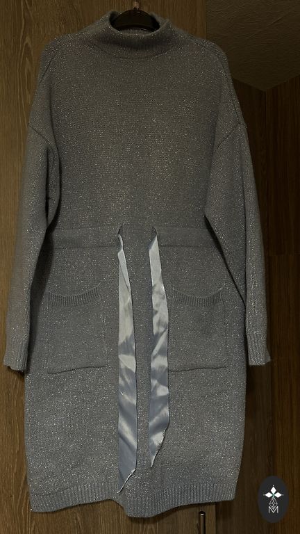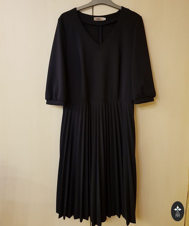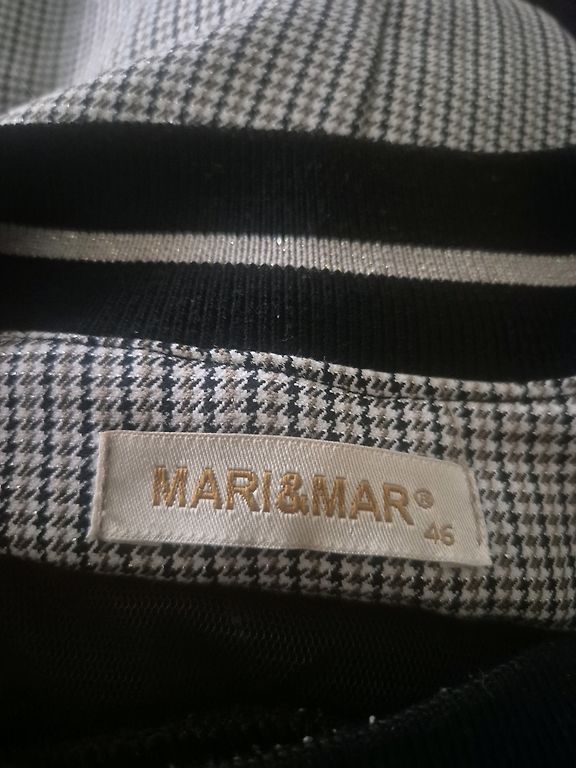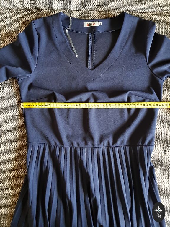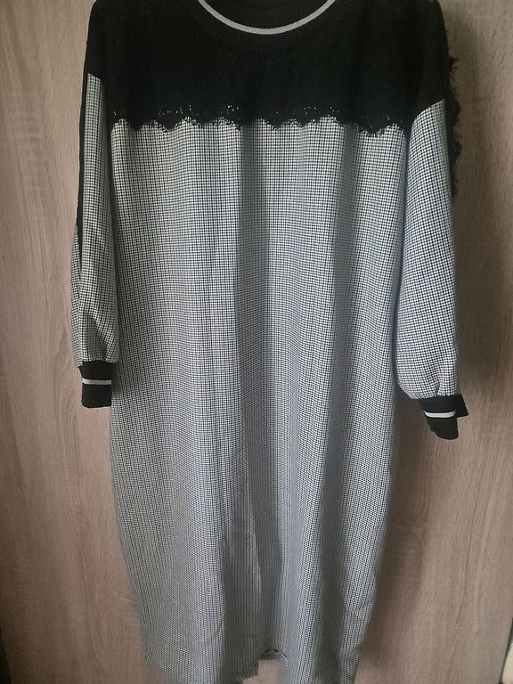 Suknelė 48 dydžio su tvirtu elastingu pamušalu, tampri. Buvo uždėta vieną kartą. Rankovės tiesiai po alkūne. Iškirpime ir rankovėse kaip mezgimas (matoma nuotraukoje). Stabilus 48 dydis. Tiks krūtinei iki 120 cm ir klubams iki 130-135 cm.