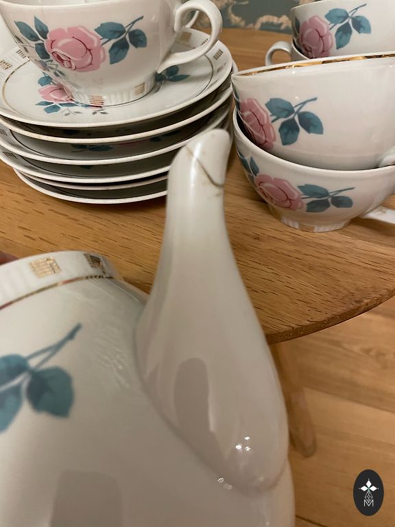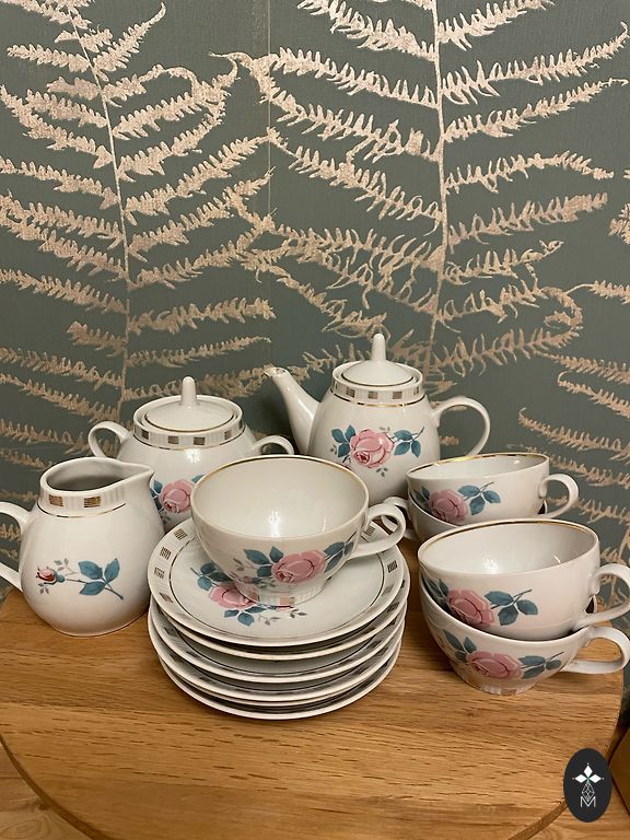 Puodeliai ir lėkštutės puikios būklės! Cukrinėje ir pieno ąsotyje aukso nusidėvėjimas, o arbatinuke ant snapelio apačios yra įtrūkimas, žiūrėkite nuotraukas.