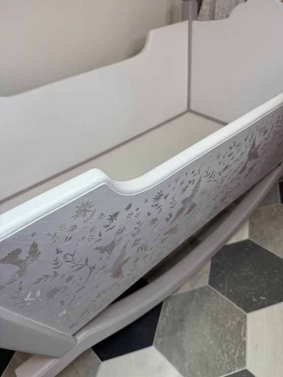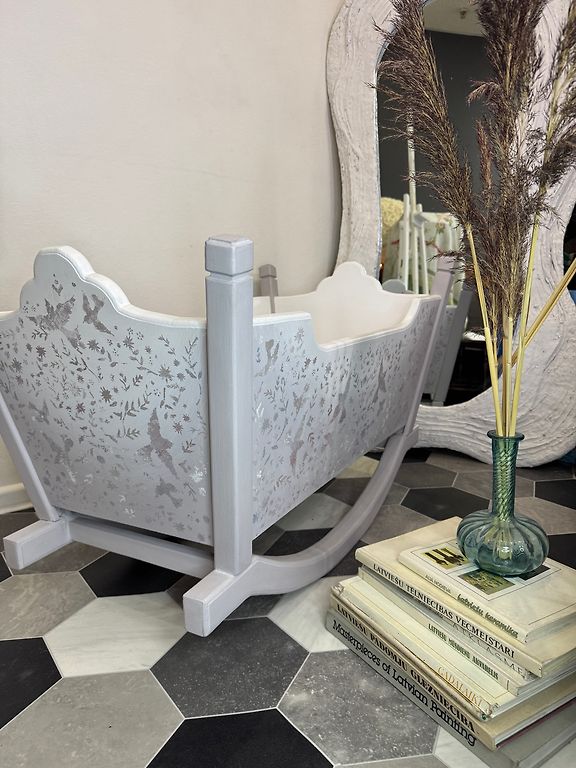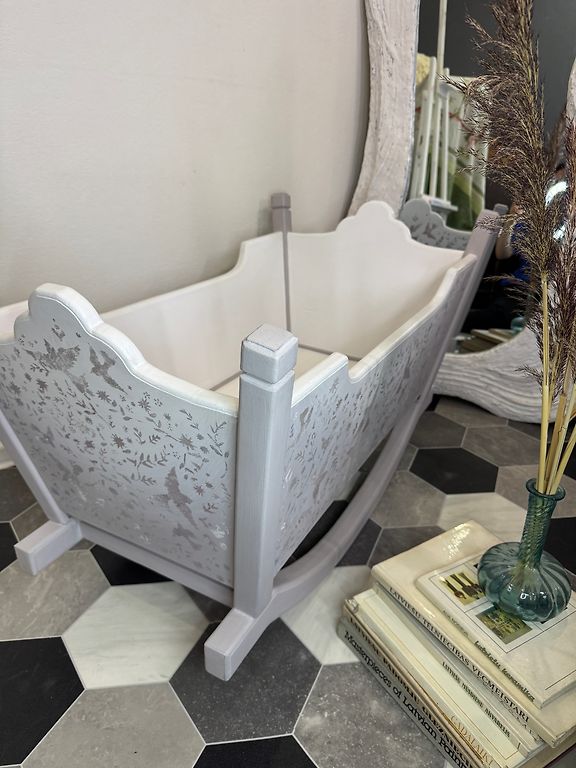 Jauks zīdaiņu šūpulītis ar redelītēm viss apkārt. Bērnu šūpulītim ir viegla šūpošanās kustība, ko var viegli nofiksēt, fiksētā stāvoklī, izmantojot fiksatoru.