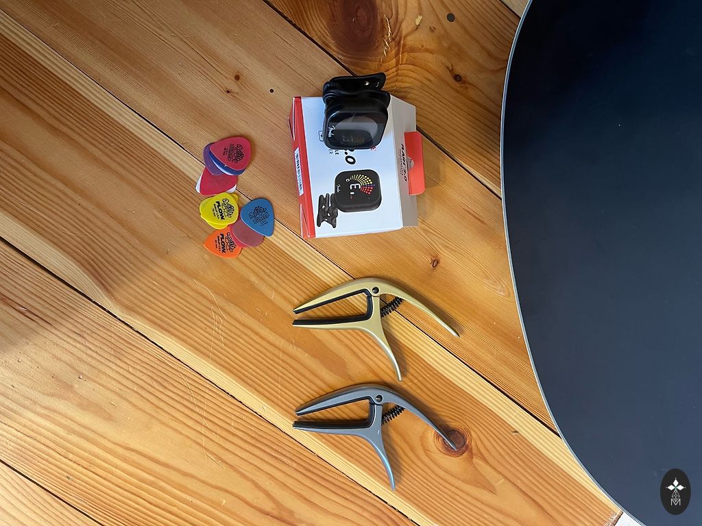 Komplekte dėklas, kabelis, diržas ir derintuvas.
