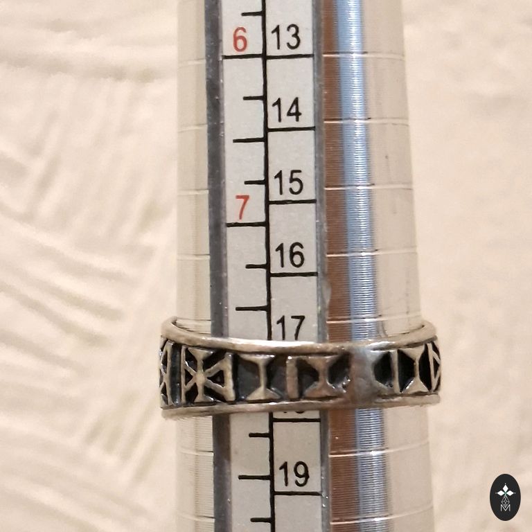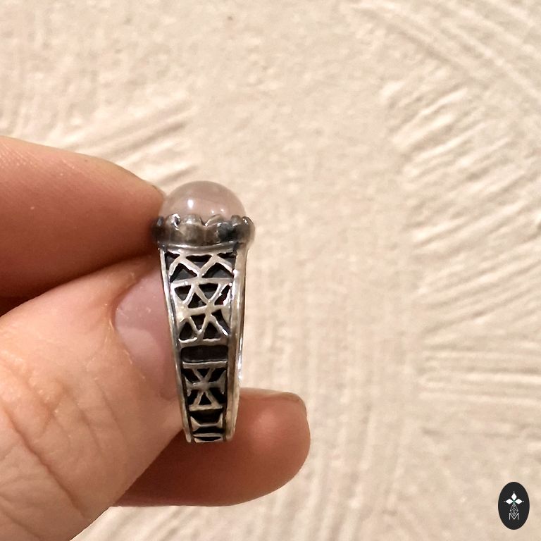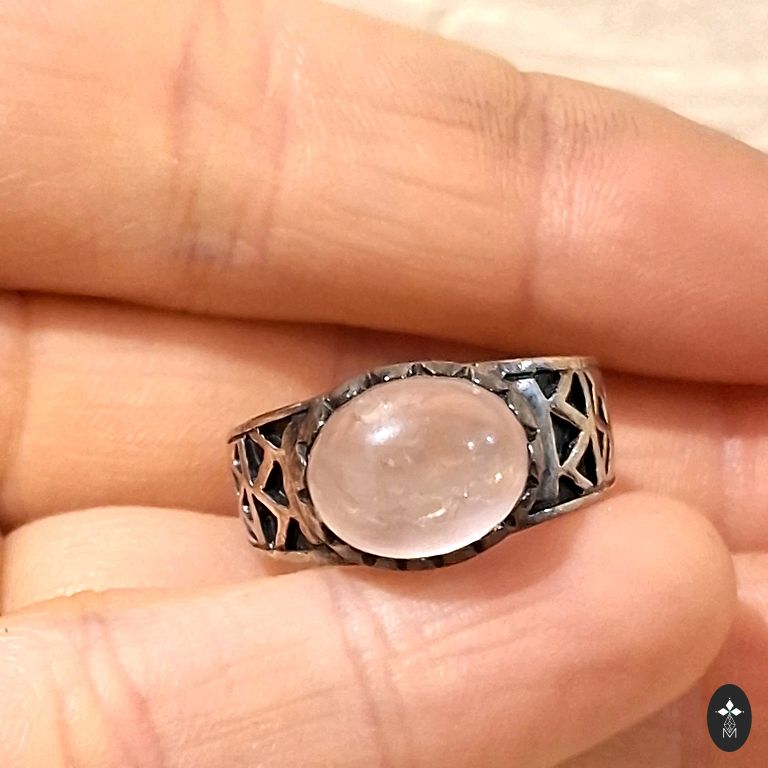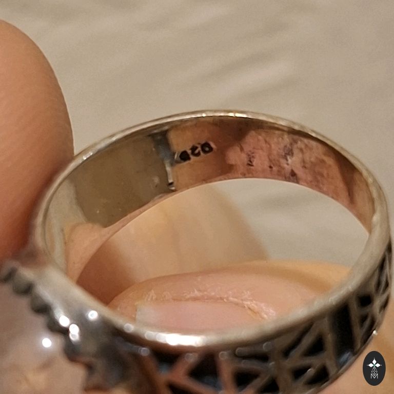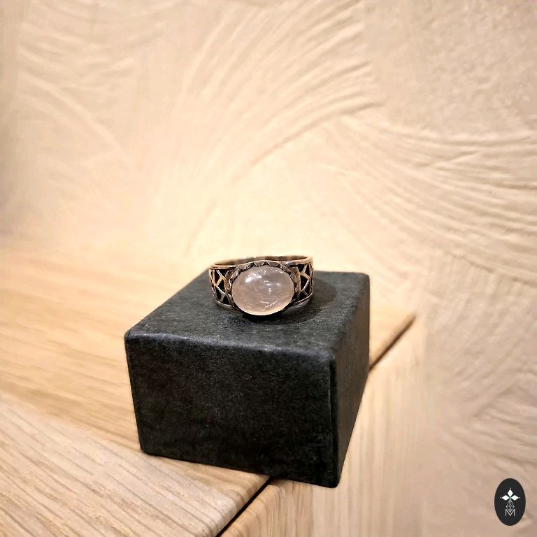 Finely ground smoky quartz, practically morion. Silver coated with an anti-allergic coating. Green sapphires in the corners. The diameter of the ring is 17.5 mm, but due to the placement of the crystal, it is 15.5-16 mm.
