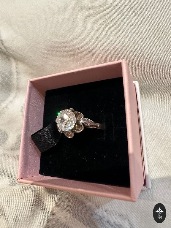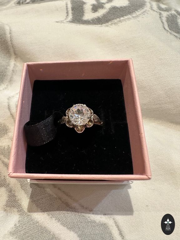 Finely ground smoky quartz, practically morion. Silver coated with an anti-allergic coating. Green sapphires in the corners. The diameter of the ring is 17.5 mm, but due to the placement of the crystal, it is 15.5-16 mm.