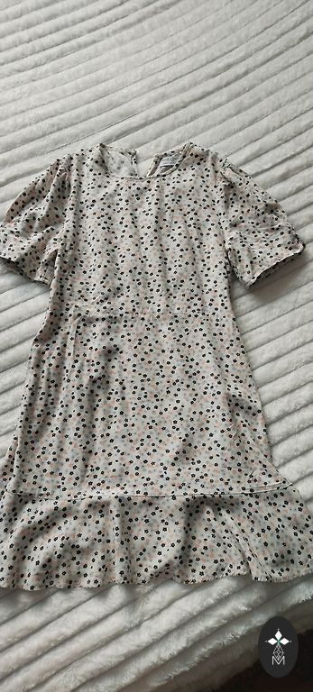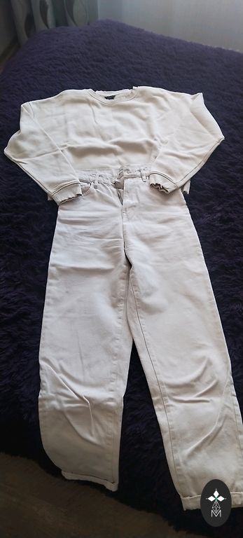 Nešiotas keletą kartų. Geros būklės. Ant balto audinio yra pageltusių dėmių. Viršutinė dalis – ilgis 45 cm, krūtinė 84–85 cm. Šortai: juosmuo 62 cm, klubai 88 cm, ilgis 33 cm.