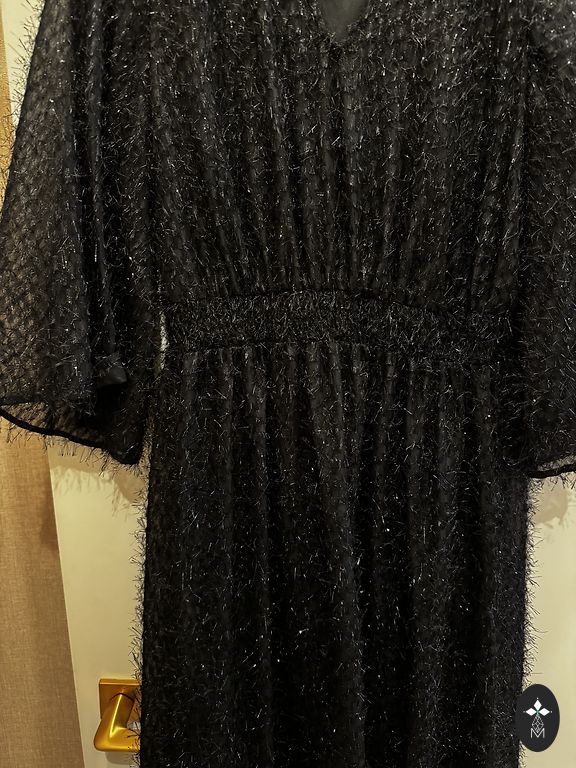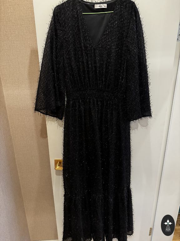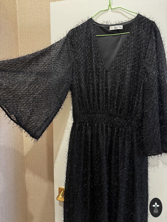 Kleita vilkta vienu reizi uz žetonvakaru. Bez defektiem. Audums - glauns, spīdīgs, smags, melns satīns. Kleita ir gara, piemērota meitenēm virs 170 cm. Uz kleitas izmērs - 40 (sk. bildē). Priekšējās daļas garums ir 143 cm. Viduklis ir 37 cm. Kleitai muguras daļā ir krusts, aizmugurē kleita sēž uz gurniem. Krūšu daļā ir polsterējums. Dekoltē zona aizsegta, plecos lencītes. Vienā sānu daļā ir šķēlums (sk. bildē). Ļoti skaista kleita, noteikti varu atsūtīt bildes, kā izskatās uz manis, lai redzētu kleitu vēl labāk.
