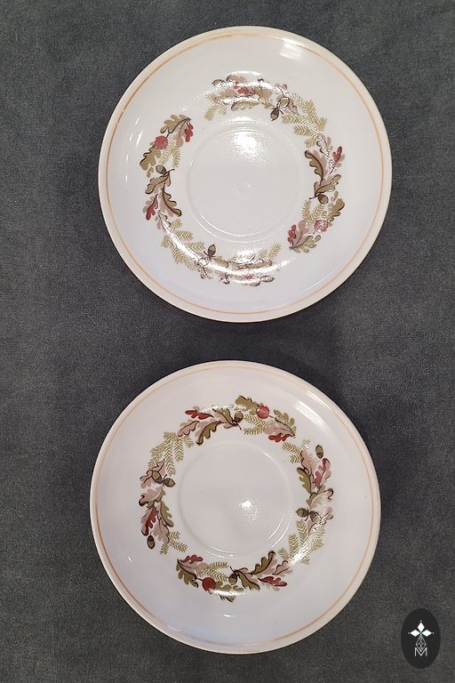70-ųjų metų suvenyrų komplektas - dvi plonos presuoto faneros lėkštės, kurių skersmuo 27 cm, kiekvienai po peilį, šakutę ir audinio servetėlę. Komplektas nenaudotas, tačiau pati dėžė per laiką persikraustant nukentėjo. Peiliams Solingen graviravimas.