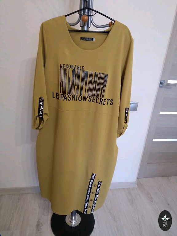 Itališkas suknelė. Graži spalva. Tinka stabiliai M ir L dydžiams. Laisvai krintanti, uždengia apvalumus ir daro lieknesnę. Ilgis 103 cm. Nuo pažasties iki pažasties 53 cm. Antros tokios LT nėra. Auksinės krašteliai.