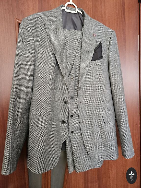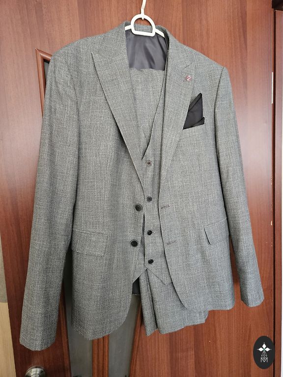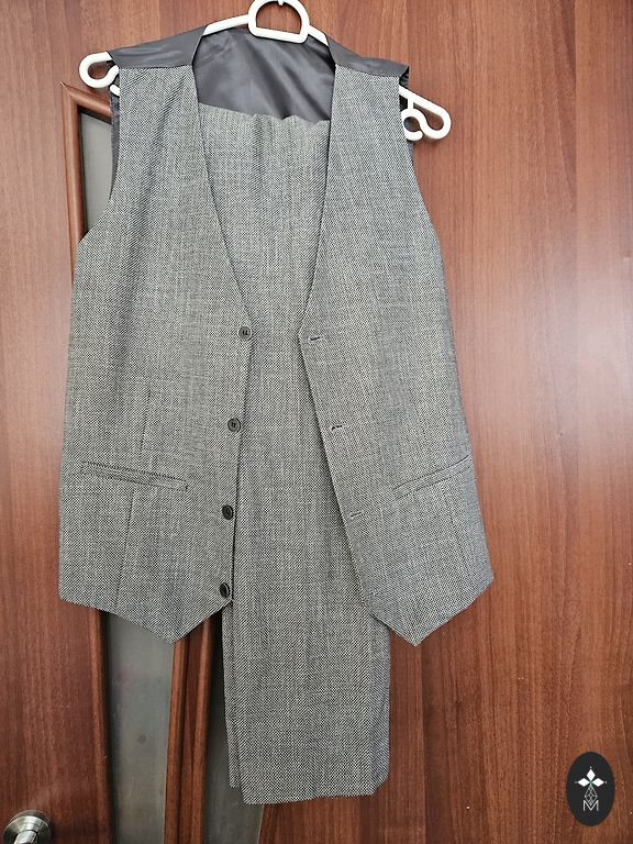 Отличный праздничный костюм, состоящий из жилета, жакета и брюк. Состояние новых вещей, надет 1 раз на пару часов. Куплен в магазине "Mans Drēbju Skapis". Ширина жакета в плечах - 44 см. Грудь - 50 см. Длина жакета - 72 см. Длина рукава - 59 см + 5 см. (Рукава нужно было укоротить, поэтому они были отворочены и слегка подшиты до нужной длины, это можно легко распороть и ничего не будет заметно, край не заглажен). Ширина брюк в талии - 43 см. В бедрах - 52 см. Длина - 96 см + 14.5 см. (Брюки нужно было укоротить, поэтому они были подогнуты и подшиты до нужной длины, это можно легко распороть и ничего не будет заметно, край не заглажен). В настоящее время костюм идеально подойдет на размер S и рост 160 см.
