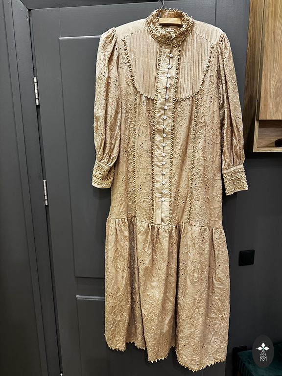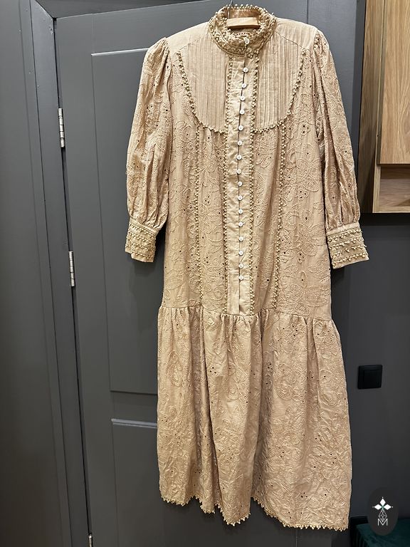 Väga ilus, värvikas kleit. Ebatavaline kaasaegne kortsunud kangas. Sobib kandmiseks kingade, poolsaabaste või tossudega. Reguleeritav kaelus. Pikkus õlast 132 cm. Kanda ainult kodus. Ma pole seda kunagi väljas kandnud.