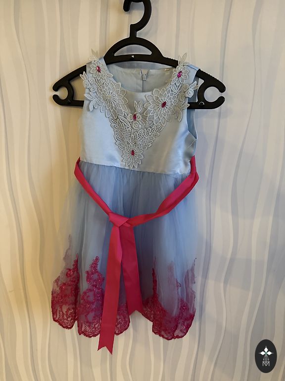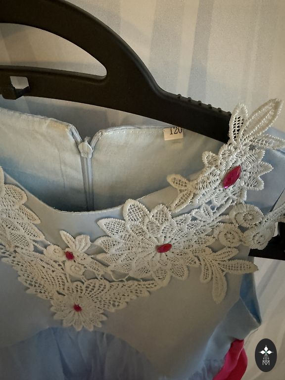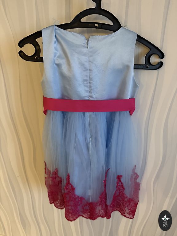 Oficiali suknelė, pažymėta 140 cm, bet iš tiesų tinka 122–128 dydžiams. Suknelės apatinio sluoksnio ilgis – 69 cm.