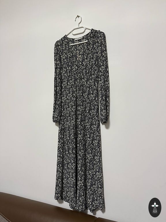 Платье большое с павлиньими перьями и длинными рукавами.