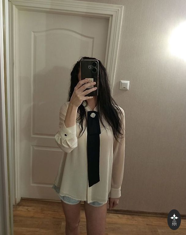 White oversized shirt-blouse with stylish expressive textured embellishments. Do not be intimidated by the appliqués, the shirt can be successfully washed in a washing machine. The fabric properties do not require ironing each element after washing. It will also fit size 46, although size 44 is indicated on the label. Price 5€ + shipping.