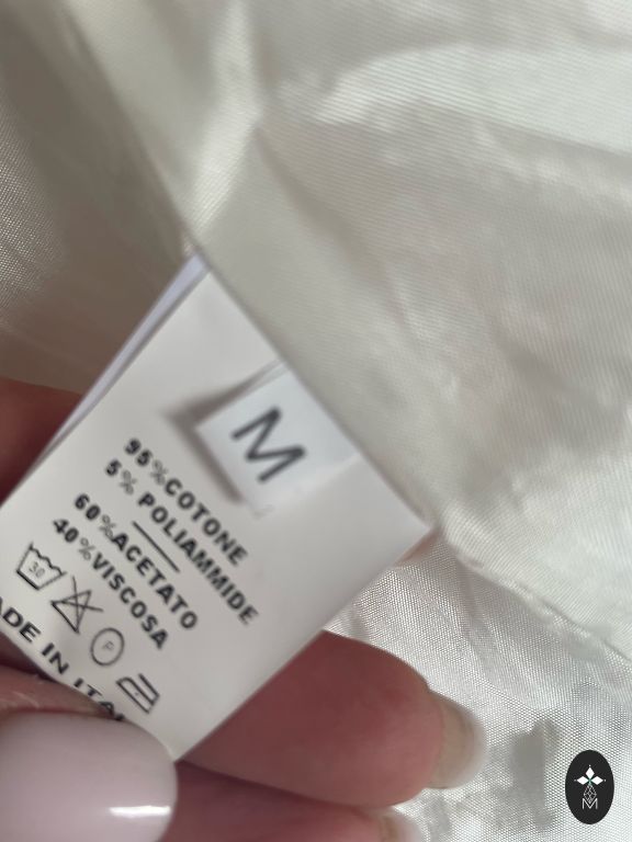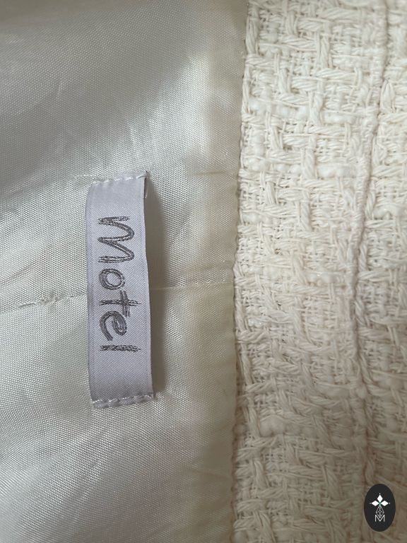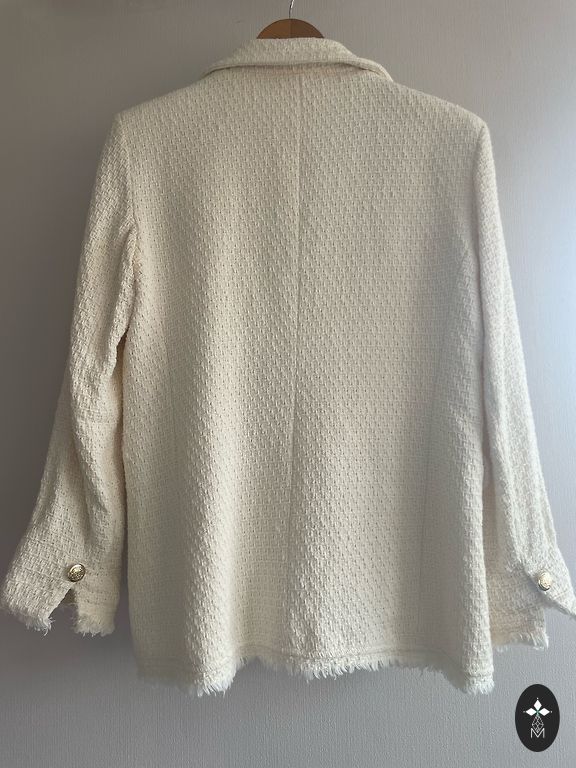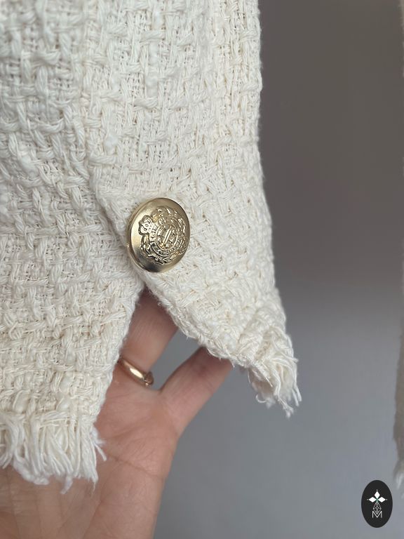 Gaiša, piena krāsas džinsu jaciņa. Aizdare ar pogām. 98% kokvilna, 2% elastāns. Trūkumu nav. Krūtīs ap 45 cm x 2, garums no pleca vidus uz leju ap 55/56 cm.