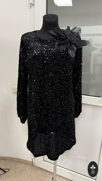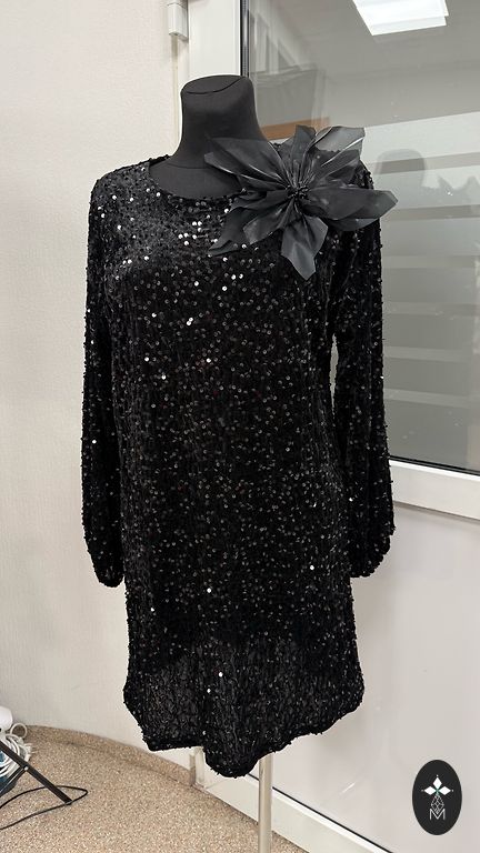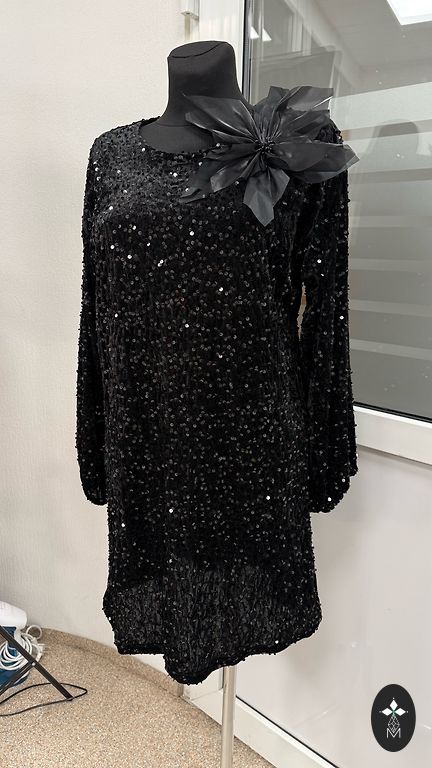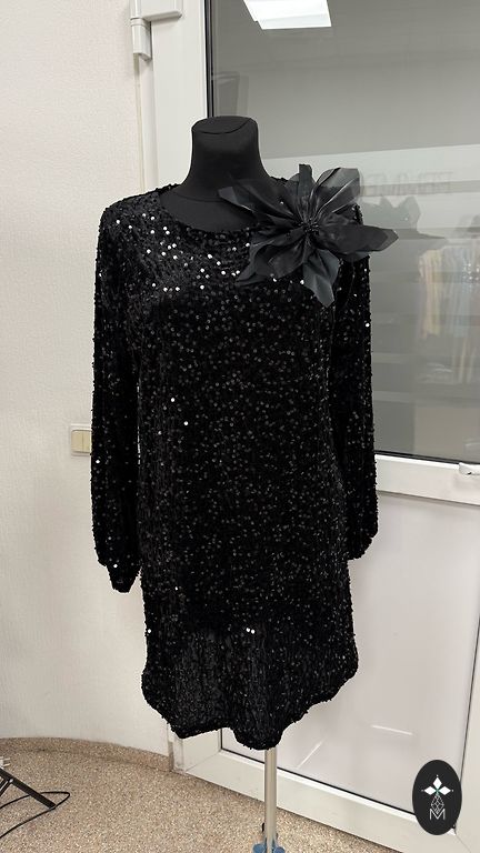 Norādīts 44/46izmērs. Augšdaļa melna ar sīku sudraba spīdumiņu. Apakšējā daļa staipīga.