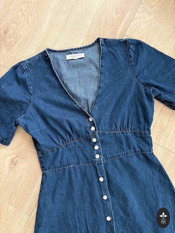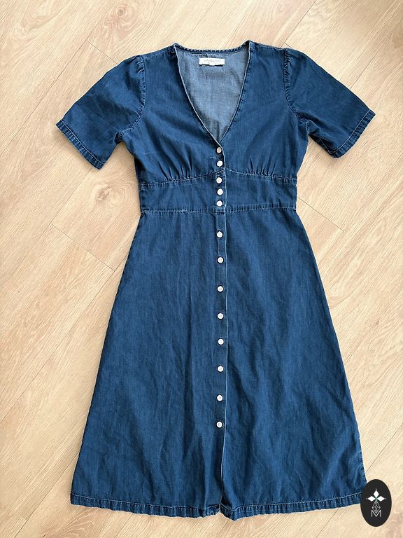 Džinsinis suknelė, 42 dydis, krūtinė 50 cm x 2, ilgis 97 cm. Plonas džinsas - medvilnė. Niekada nedėvėta, kainos etiketės nėra.
