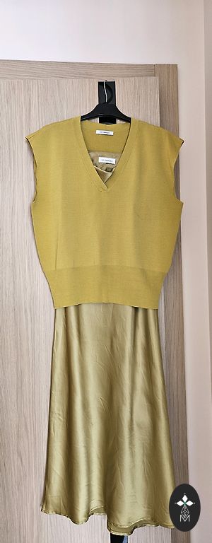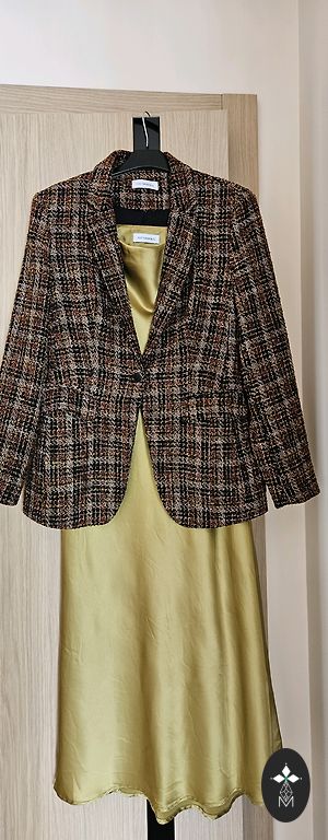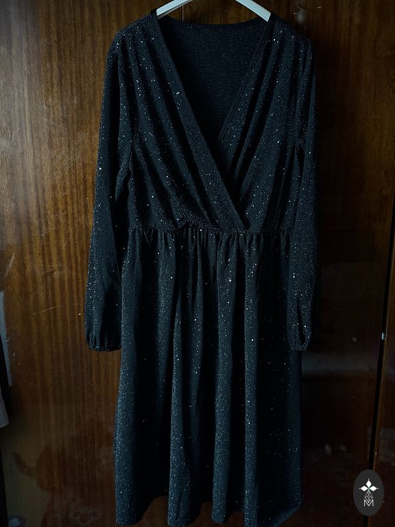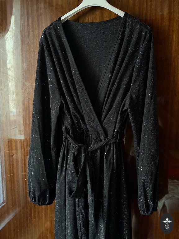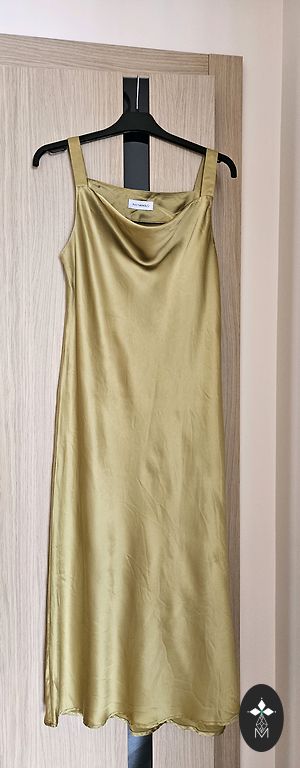 Зеленое, длинное платье с кружевами.