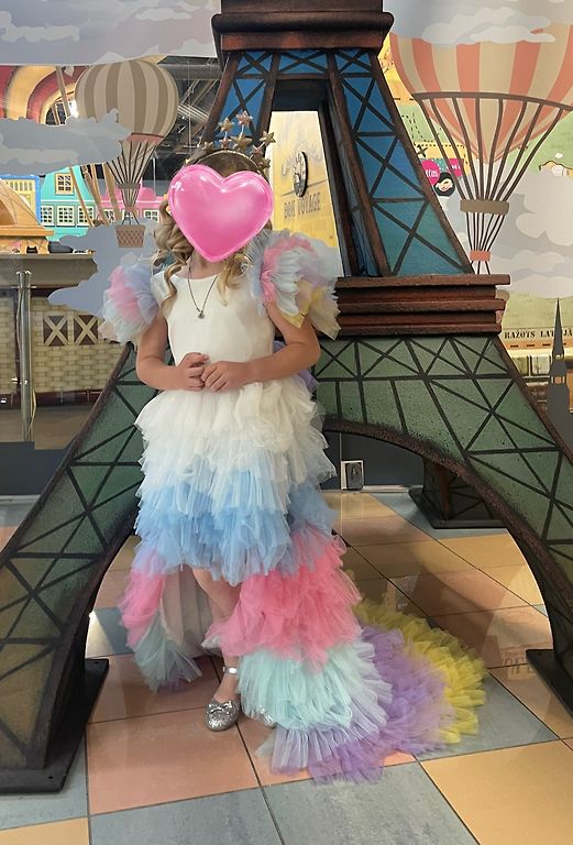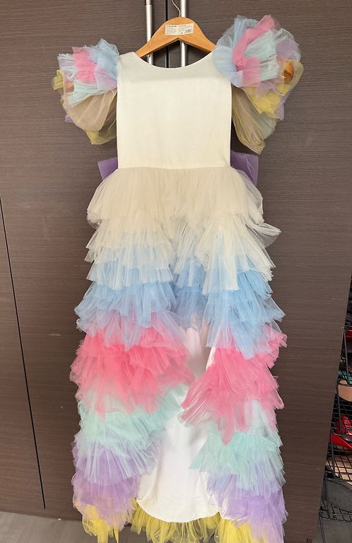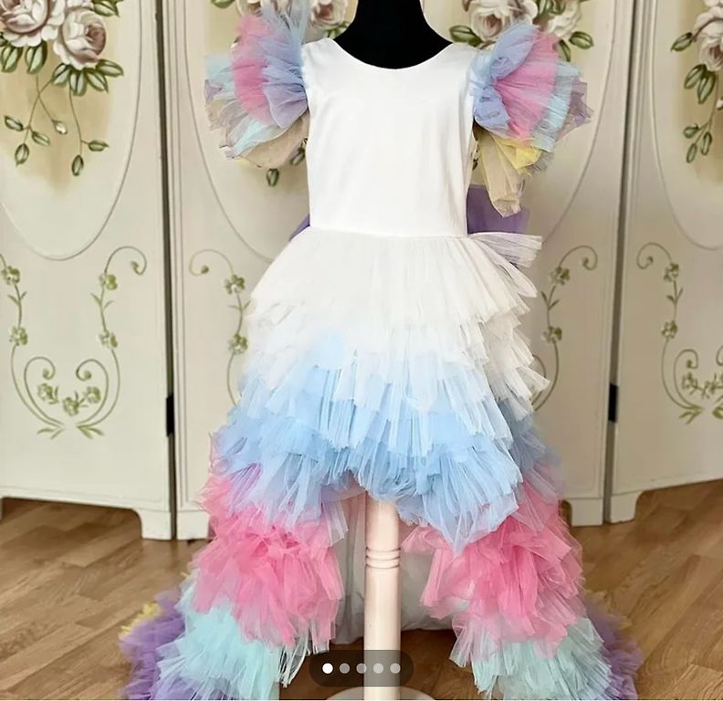 Super puošni, labai pūsta suknelė. Suknelė pasiūta pagal užsakymą, antros tokios niekur nėra. Suknelė pagaminta iš satino su tiulio apatiniu sijonu, visiškai rankų darbas. Diržas iš karoliukų ir kaspinas buvo pagaminti rankomis. Kiekvienas karoliukas buvo prisiūtas rankomis. Kaspiną galima nuimti. Dydis 116-122. Kadangi ilgai gulėjo spintoje, susiglamžė, reikia išlyginti! Kadangi audinys labai delikatus, galbūt kažkur yra kelios nereikšmingos užkabinimai, kurie nėra labai pastebimi.