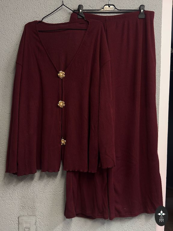 50 dydis. Švarko ilgis 93, krūtinės apimtis 120 cm. Kelnių ilgis 98, juosmens apimtis 82 cm (guma), su kišenėmis.
